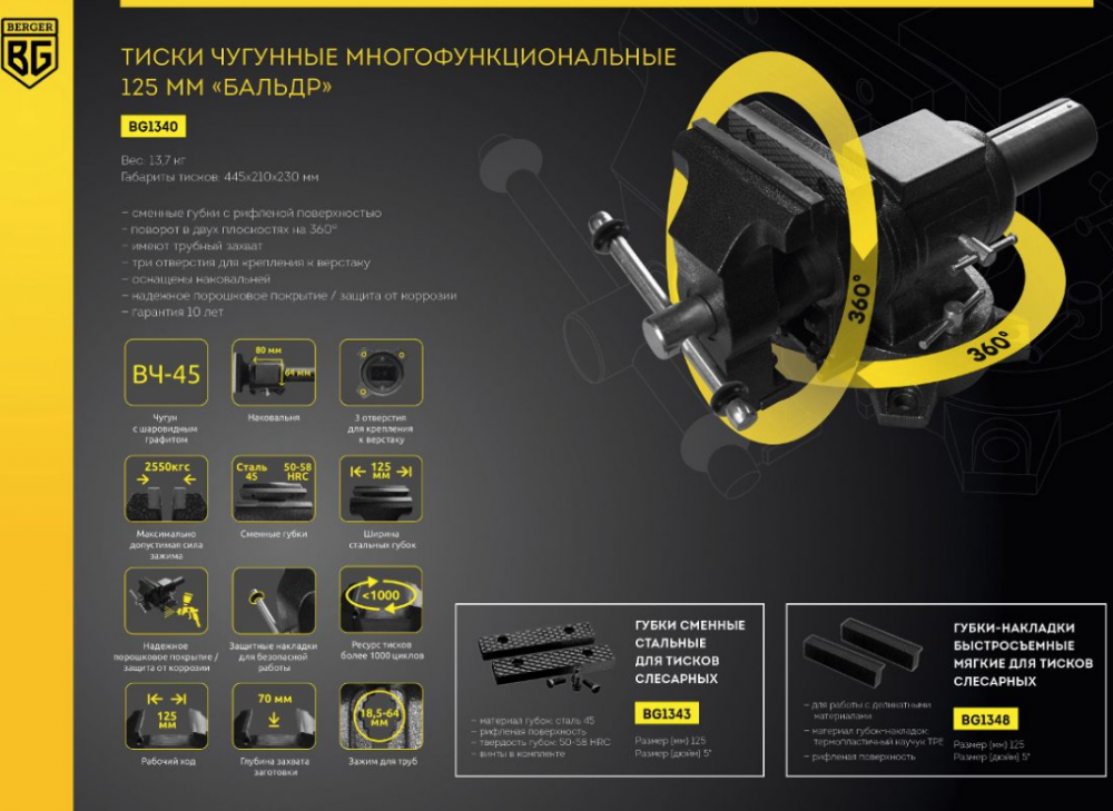 - Тиски чугунные многофункциональные "БАЛЬДР" 125мм BERGER BG1340